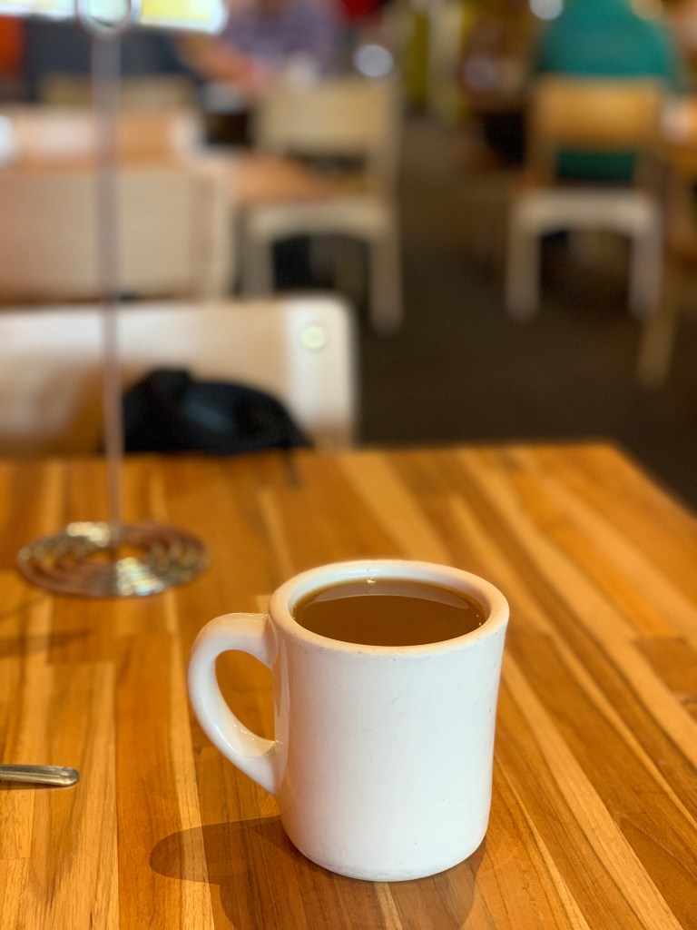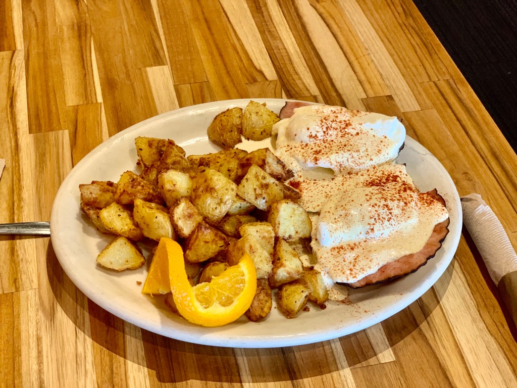 I discovered that the café was structured using counter service instead of table service. To be truthful, I generally don’t like this style. It feels impersonal, like a school cafeteria (maybe giving me school lunch flashbacks!?!), and fast food-like. So, I was a bit disappointed that there was no table service. However, after reflecting, I decided this was actually the ideal scenario for dining alone. No awkward interactions with waitstaff, and no feeling guilty for taking up a table with only one person and worrying the server is secretly wanting you to hurry and give up your table to a larger party. Instead, I ordered at the counter: drip coffee (serve yourself from a station), a cup of almond milk at my request (replacement for cream), and classic Eggs Benedict. The people working behind the counter were very kind and patient with me, as I took a few minutes to wade through the lengthy menu and make decisions.