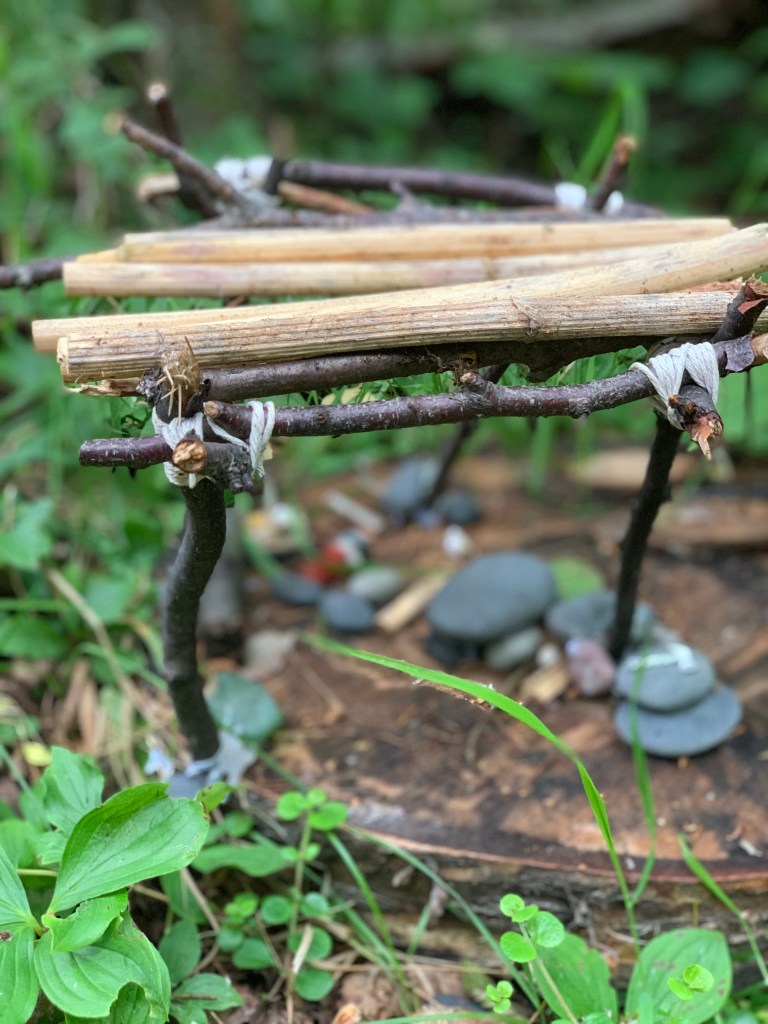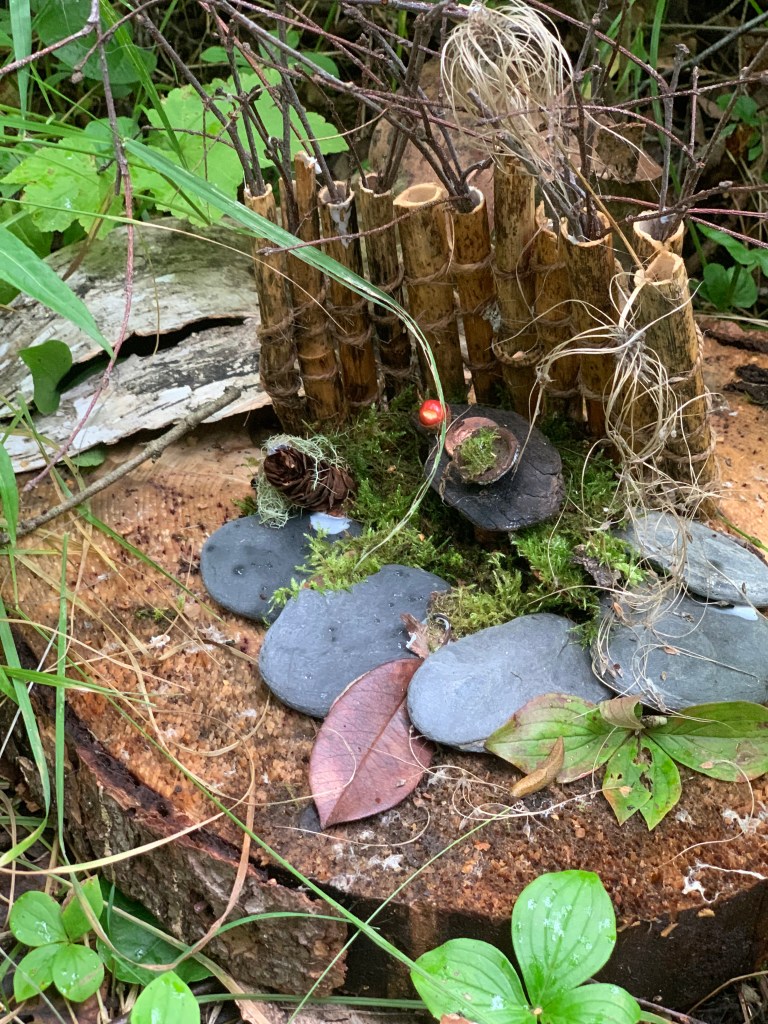 Entering the forest, we felt enclosed, like we had entered a secret space. The ground was covered with an assortment of plants, leaves, twigs, dirt, a regular potpourri. We walked along the path carefully and almost missed them! But there they were! Very small fairy houses were spaced along either side of the trail, assembled from natural materials like twigs, bark, leaves, and mosses. Some had flat roofs; some had sharp pitches. A few of the fairy houses had little gardens. The structures blended in to the surroundings. The forest was denser and wilder here.
