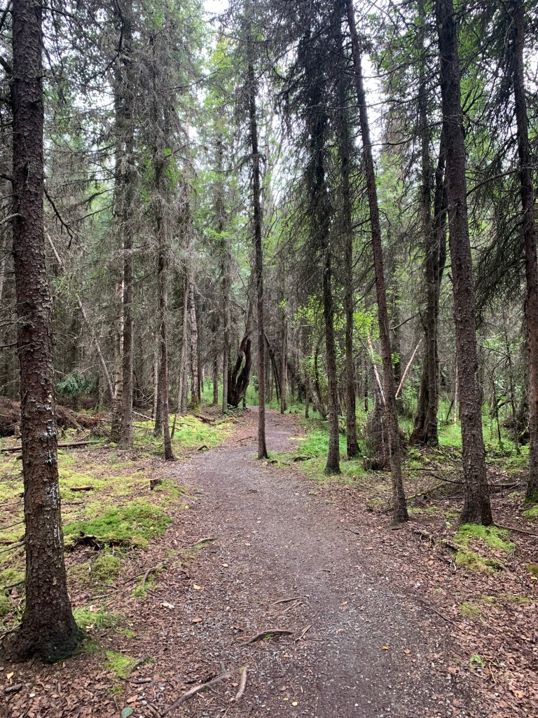 After crossing the bridge, the path continued ahead of us, but a small, narrow path that looked like a single track trail snaked up a hill on the right into the trees. Could this be it? We clambered up to see.