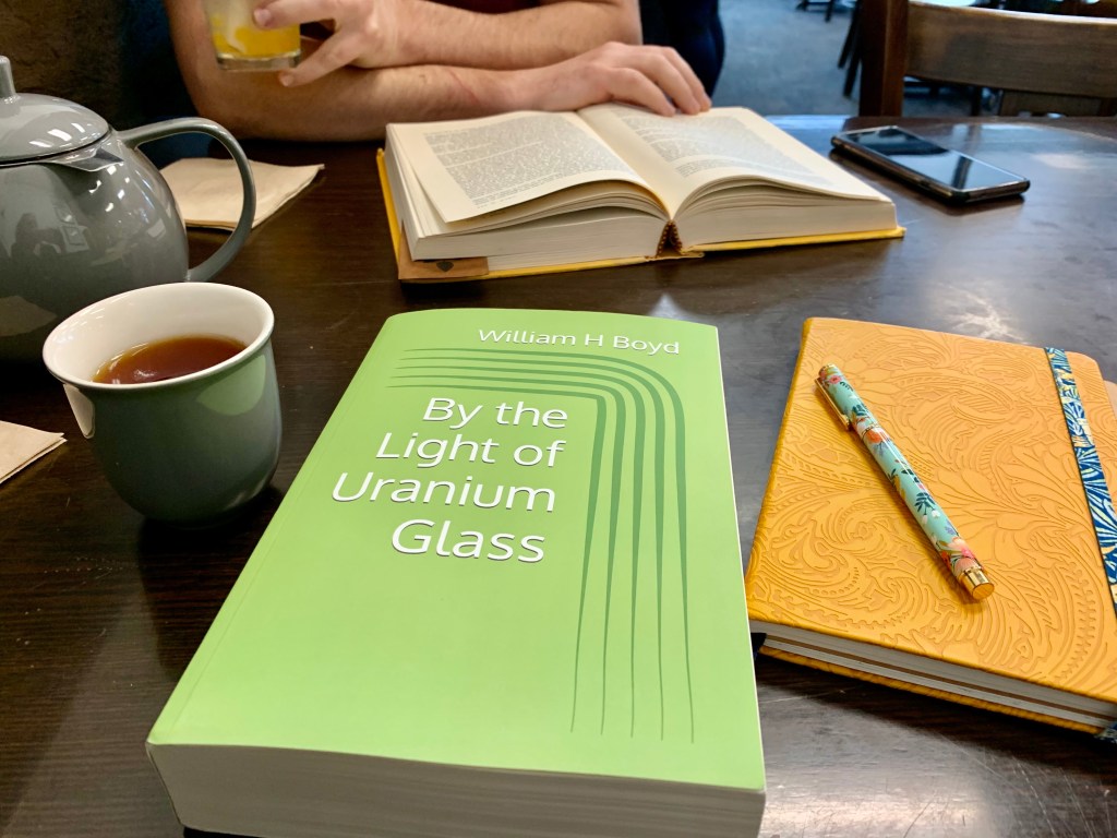 On this occasion, we went to the counter and rang the bell. An employee appeared from behind the curtain separating the counter from the back space. My husband ordered an iced ginger mint tea with mango boba and a peanut butter cookie. I asked for a pot of cinnamon rooibos and a chocolate chip cookie. We sat at one of the wooden tables for an hour or so, sipping our drinks and nibbling our cookies, while a light rain drizzled outside. I read By the Light of Uranium Glass by William H. Boyd, and my husband pretended to read Alaska by James Michener. There’s nothing more pleasant and cozy than watching rainy weather through the window while comfortably passing the time indoors.
